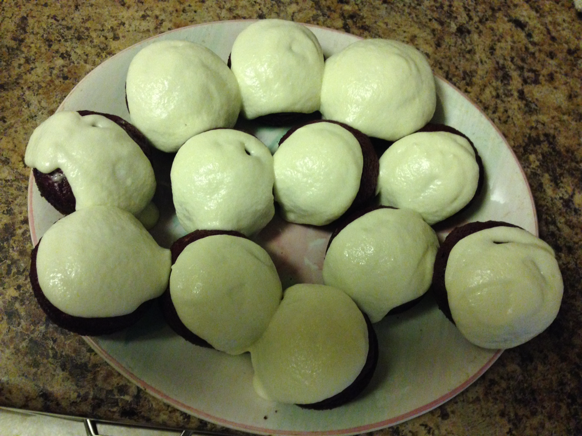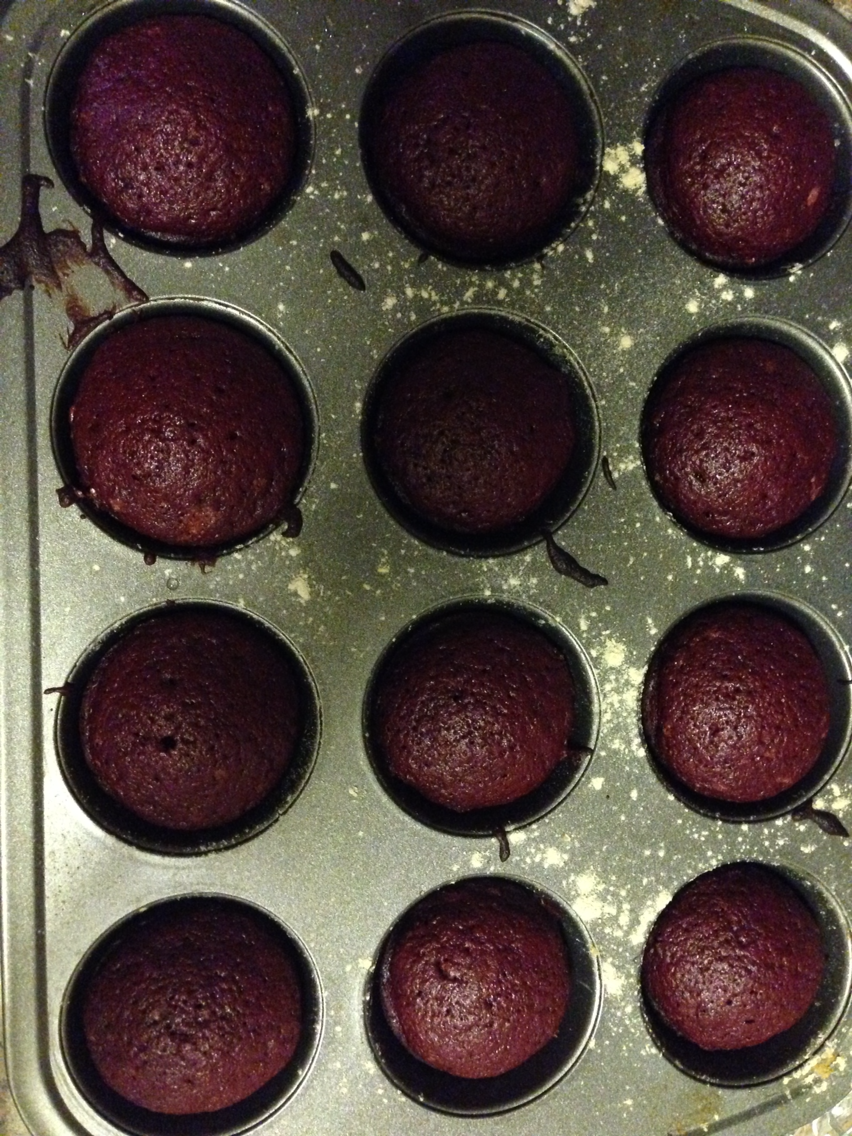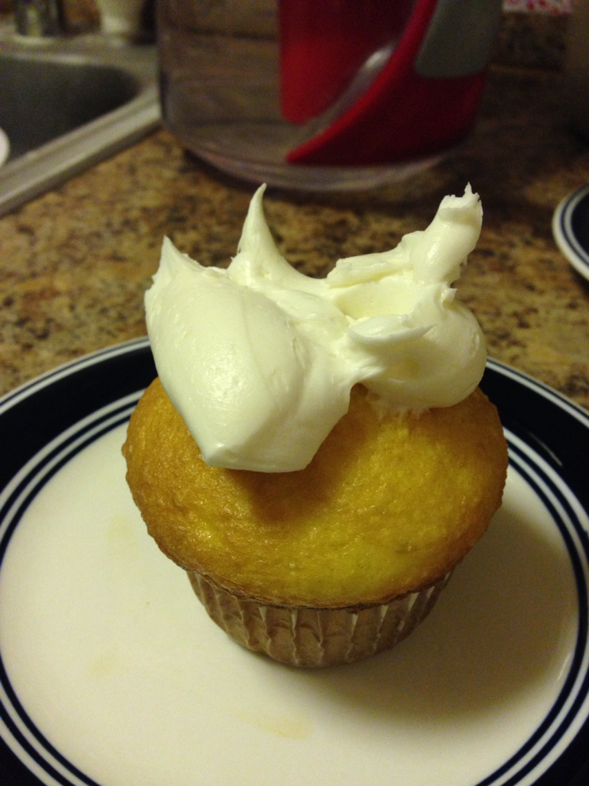 첫 컵케이크. 믹스는 참 쉽고 달다. 머핀 구울 때처럼 유산지컵을 뺐더니 프로스팅이 흘러내려 심란한 모양이 됨.