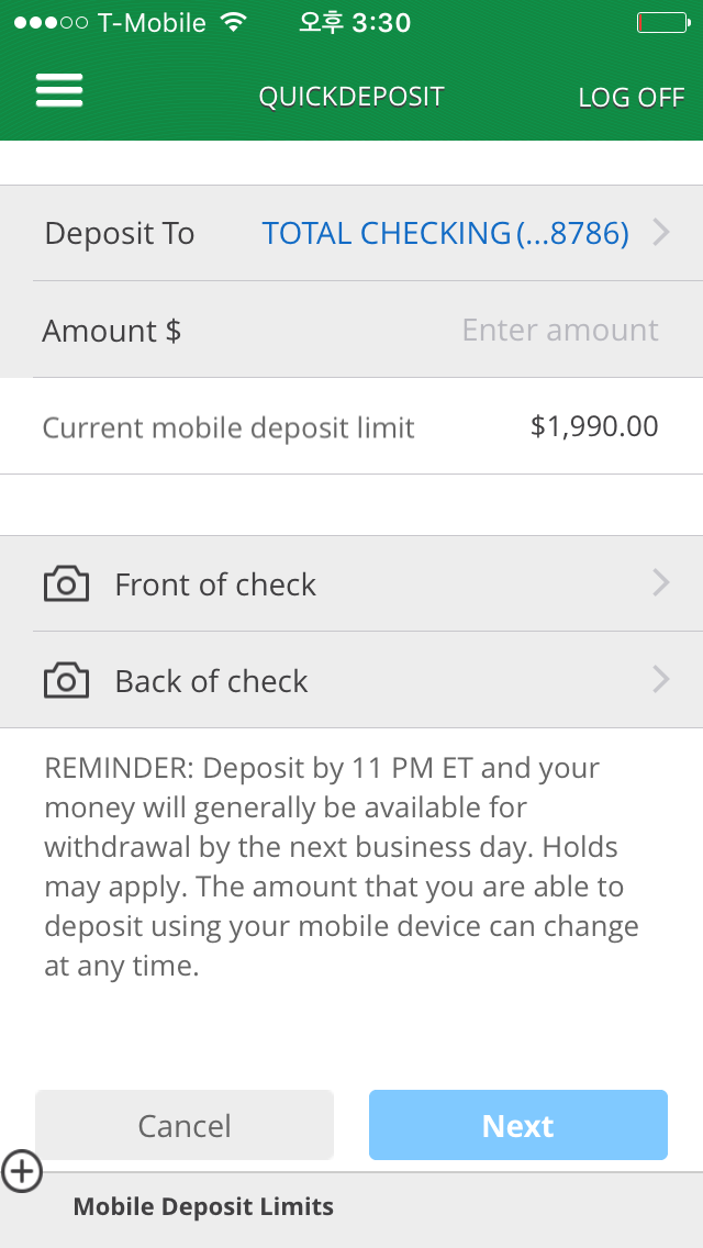 요기를 꾹 누르면 금액을 입력한 다음 촬영을 해서(수표 뒷면에는 반드시 내 서명을 더해야 함)