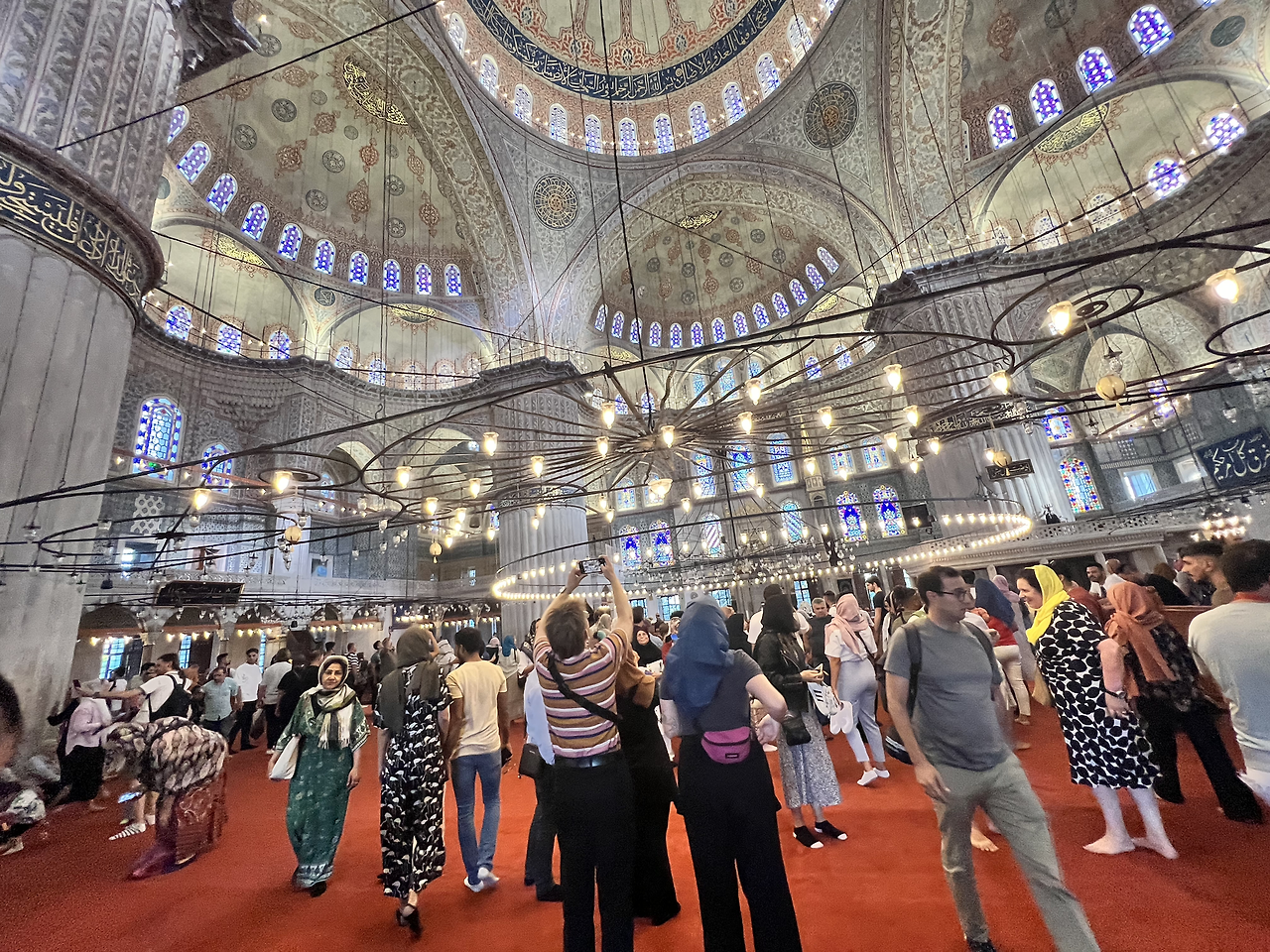 모스크 내부는 아야소피아 성당보다 다소 작은 규모였지만 화려하게 장식된 천장의 무늬들을 정말 장관이었다. 천장의 한가운데 가장 높게 솟은 부분의 무늬들이 푸른색을 띠고 있어 블루모스크라고 불리는 것 같았지만 주황색 조명 때문인지 전체적으로 황금색을 띠고 있어 블루모스크라는 별명이 무색해져 버린 듯했다.