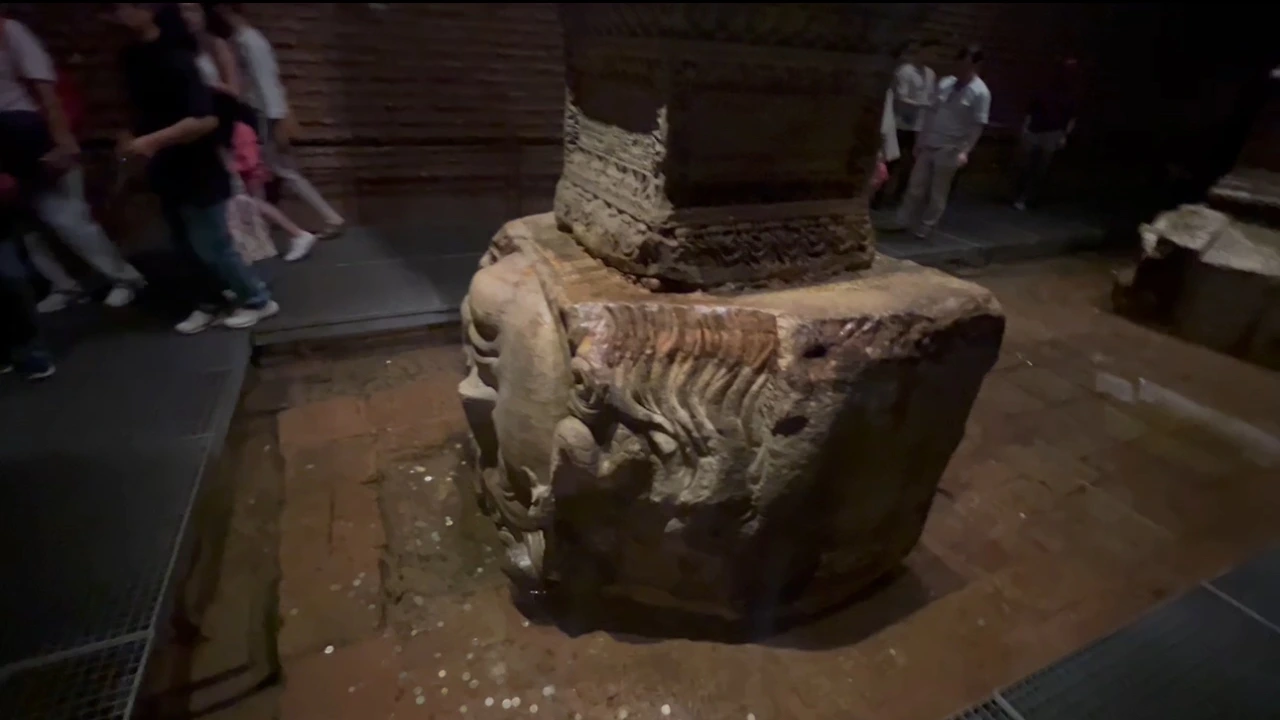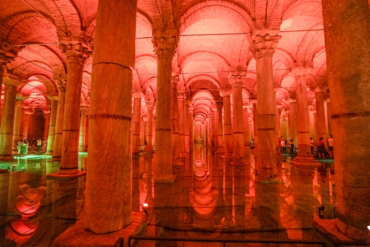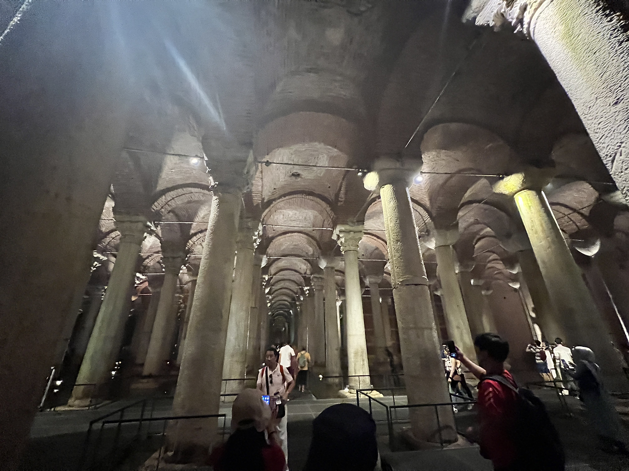 줄이 금세 줄어들어 많은 기다림 없이 예레바탄 지하궁전으로 입장할 수 있었다. 예레바탄 사라이는 사실 궁전이 아닌 수도공급을 위한 저수지로 만들어진 곳이다. 콘스탄티누스 대제 때 공사를 시작했다는 이곳은 지하공간 유지를 위해 어마어마한 기둥 336개를 놓아 천장을 받치고 있었는데, 이 기둥들이 저수지 건설을 위해 새로 만든 것이 아닌 기존 유적지에 있던 기둥들을 가져다 재활용한 것이라고 한다. 여러 시대의 유적지에서 가져온 기둥들이기 때문에 기둥들을 조각한 양식들이 시대별로 서로 다른 것이 관광 포인트이기도 하다.