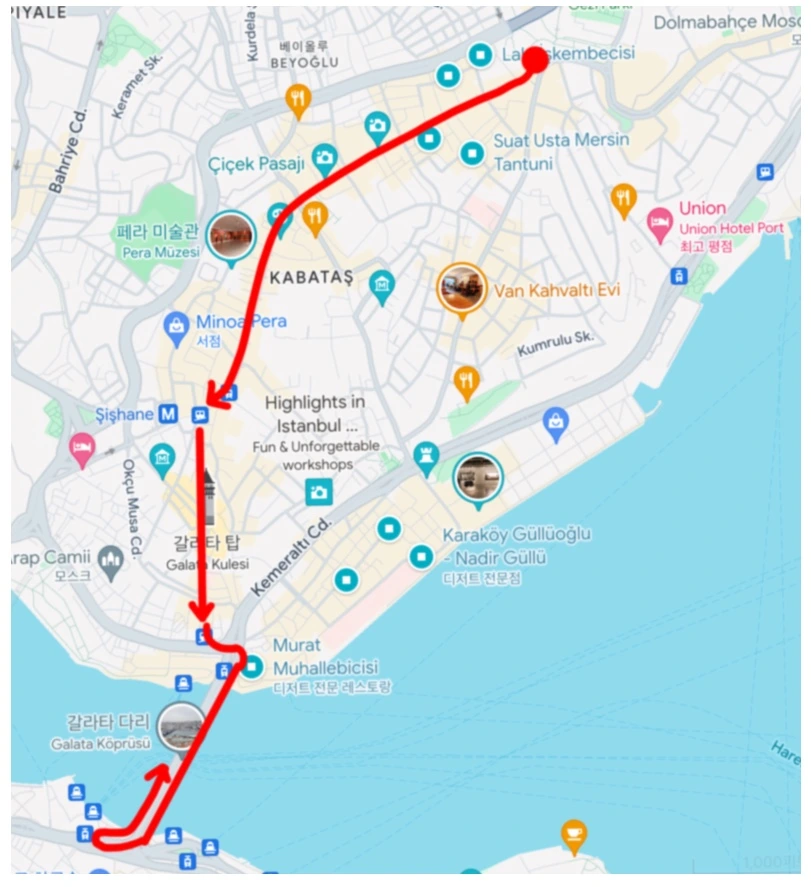 이스탄불의 명동이라고 불리는 게 당연하다고 생각될 만큼 많은 상점들이 끝없이 자리 잡고 있었고, 수많은 사람들이 모여 활기찬 거리를 만들고 있었다. 다만 대부분의 상점들은 젊은 사람들의 취향에 맞춰져 있어, 부모님과 삼촌은 크게 흥미를 느끼시지는 못했다. 그 와중에 삼촌께서 화장실을 가셔야겠다고 하셔서, 거의 30여분을 화장실을 찾아 돌아다녔고 결국 어느 쇼핑몰에 들어가서 급한 일을 해결할 수 있었다. 조금 지친 우리 가족은 쇼핑몰 안에 있는 카페에서 음료를 마시며 잠시 쉬고 있었는데 한국어를 공부하는 튀르키예 사람이 한국어로 말을 걸어와서 신기해하기도 했다.