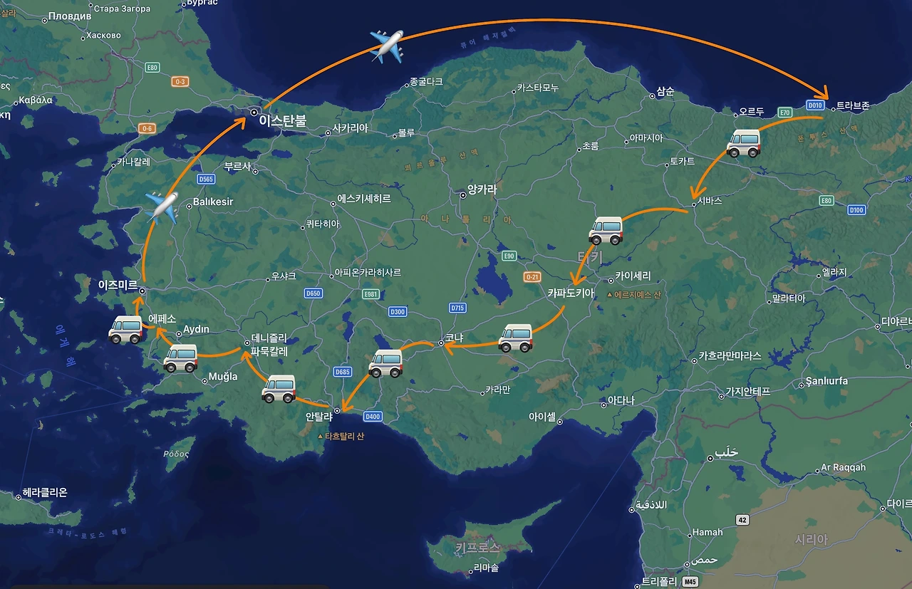 튀르키예 패키지는 여행을 몇 가지 검색해 보니 보통 이스탄불에서 시작해서 버스를 타고 동쪽으로 이동하여 중부지역을 둘러보고 남쪽으로 이동하여 지중해 지역을 돌아보고 다시 이스탄불로 돌아오는 코스가 대부분이었다. 이 코스는 버스를 타고 계속 이동하게 된다. 이리저리 몇 가지를 더 둘러보던 중, 튀르키예 국내선을 2회 타고 이동하는 여행 패키지가 눈에 띄었다. 전체 이동 경로 중, 2개의 구간이 튀르키예 국내선을 이용하도록 구성되어 보통 버스로 장시간 이동할 거리를 비행기 1~2시간에 이동하는 방법으로 대체한 것이다. 거기에 버스이동 패키지에는 포함되지 않은 '트라브존'이라는 도시를 관광하는 일정이 포함되어 있어 다른 패키지와는 다른 한 개의 도시를 더 둘러볼 수 있도록 되어 있었다. 아무래도 버스를 장시간 타는 것보다는 비행기를 타고 빠르게 이동하는 것이 피로도가 더 낮을 것 같았고, 일반 패키지와는 다른 도시 한 곳을 더 관광할 수 있어 좋을 것 같아 크게 고민하지 않고 이 패키지를 선택, 즉시 예약 하였다.