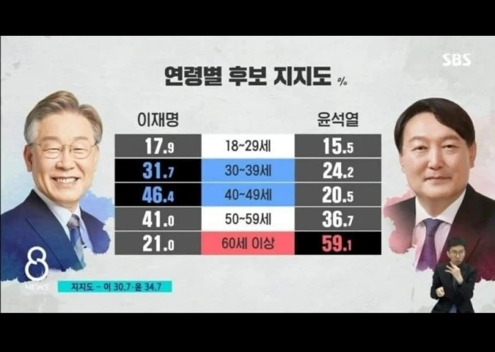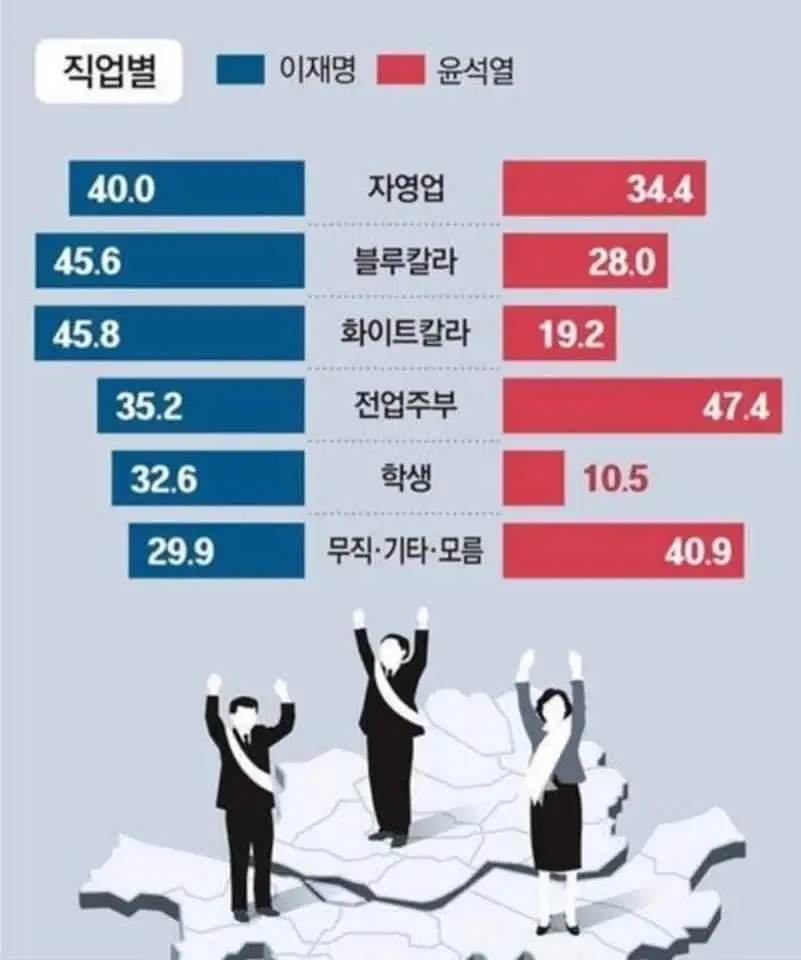 이번 대선의 년령대별 지지율이나 직업별 지지율을 보면 다음 선거에도 그 다음 선거에도 더한 세대갈등이 야기될 수 있을거라는 추측이 된다.