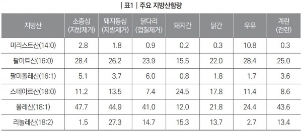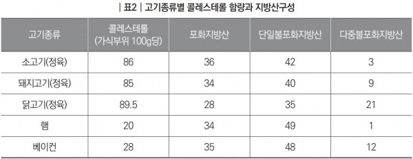 그 이유는 국내에서 소비되는 3대 육류는 포화지방산 보다 불포화지방산을 더 많이 함유하고 있으며 총 지방산 중에서 포화지방산은 1/3 정도이므로 절반정도는 단일 불포화 지방산이다. 포화지방산은 체내에서 콜레스테롤을 쉽게 만드는 역할을 하는 것으로 알려져 있으며 불포화 지방산은 콜레스테롤 수치를 낮추는 작용을 한다.