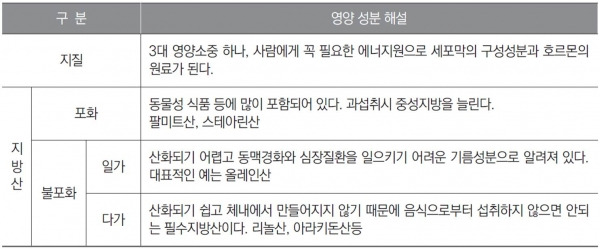 반면 식물성 식품과 생선류 등에 다량 함유된 불포화 지방산(oil)은 오메가 3계와 오메가 6계 지방산을 함유하고 있으며 오메가 3 와 오메가 6 지방산은 체내에서 합성되지 않고 반드시 식품의 섭취를 통하여 공급받아야 하는 영양소이기에 필수 지방산이라고 한다.