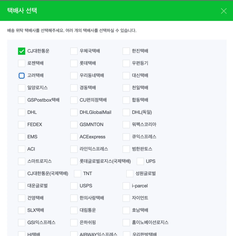 배송이 언제 도착할지 어디서 출발할지의 기준은 이렇게 등록하는 판매자의 출고지 주소로부터 시작된다. 그리고 판매자가 어떤 택배사를 이용할지 모르니까.. 아래 그림과 같이 대형 커머스에서는 모든 배송 회사의 배송추적 시스템을 연동해서 구비하고 있다. 이것 역시 각 회사와 API로 데이터 연동을 구축하는 것이다.