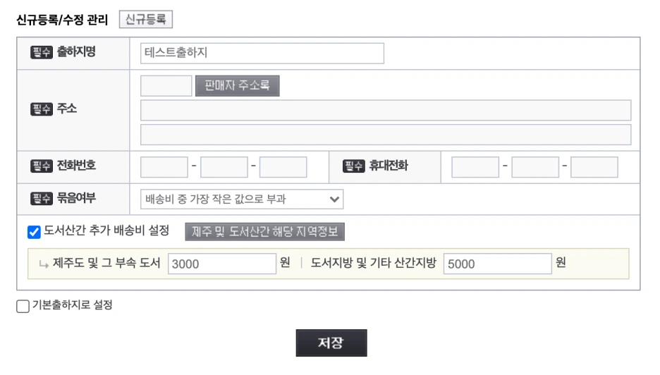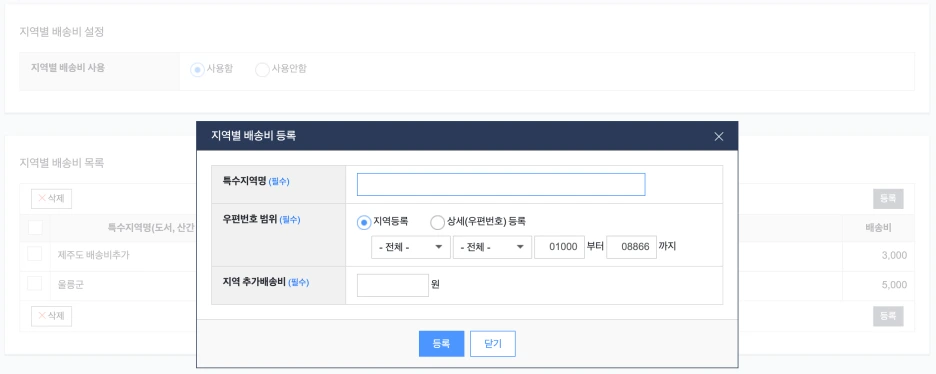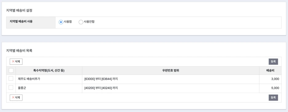 배송비 플랫폼 기획 기준에서는 이런 관리자 화면을 제공하면서 판매자별로 배송비가 다른 구간을 설정하도록 제공하거나, 판매자는 제주/도서산간 지역 주소를 각각 등록할 것 없이 일괄적으로 보편적으로 발생하는 이 지역을 사이트 전체에서 관리하고 추가 배송비가 필요한지 지역 차등 없이 모두 가격이 같은지만 판단할 수 있게 해 줄 수도 있다. 배송 출하지 정보 등록 시 , 지역 배송비 정보를 함께 저장하는 기능을 제공하는 플랫폼도 있는데 이렇게 설정할 경우 배송비 플랫폼 단위가 아니라 배송 거점 기준으로 자동으로 설정이 되고 수정 관리할 수 있게 할 수 있다.