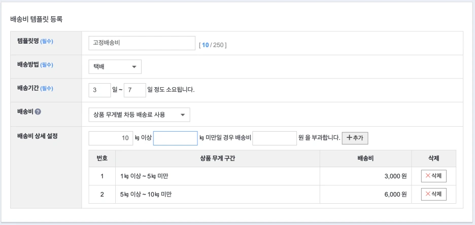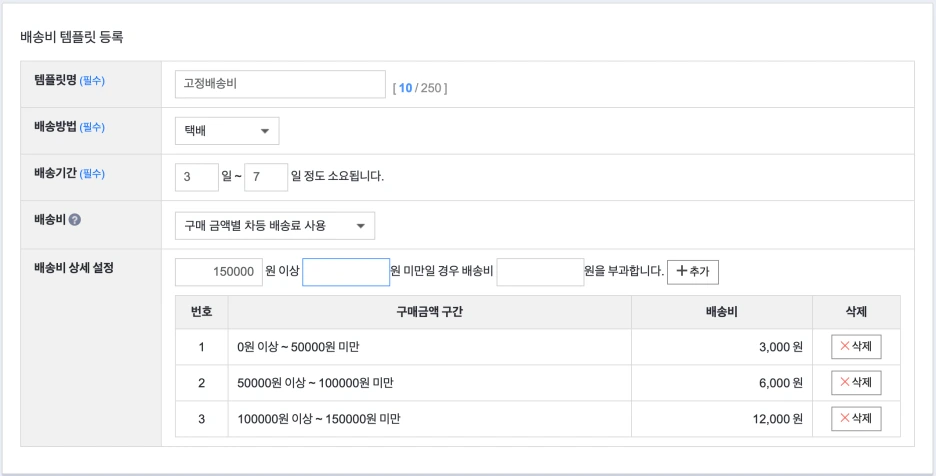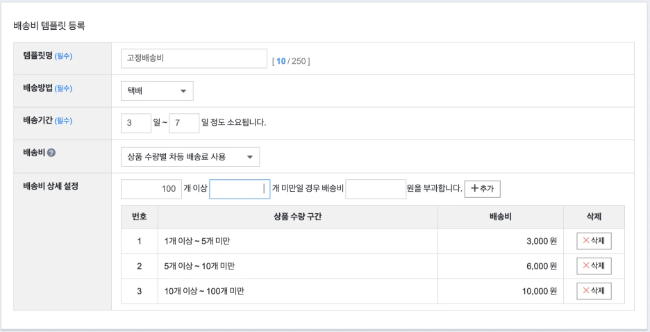 위 표에 보면 '배송비 타입' 중에 금액 차등, 수량별 배송비 이런 종류가 있는데.. 판매자 관리 설정 메뉴는 아래 그림 같은 화면으로 제공되는 내용이다. 얼마 이상부터 몇 원까지는 배송비가 3,000원, 그 이상은 6,000원 이렇게 배송비가 발생하는 경우에 대한 설정을 할 수 있는 템플릿 등록 화면 예시이다. 또 때로는 수량에 따라서 다르기도 하고, 제품의 무게에 따라서 배송비가 더 필요하기도 하다.