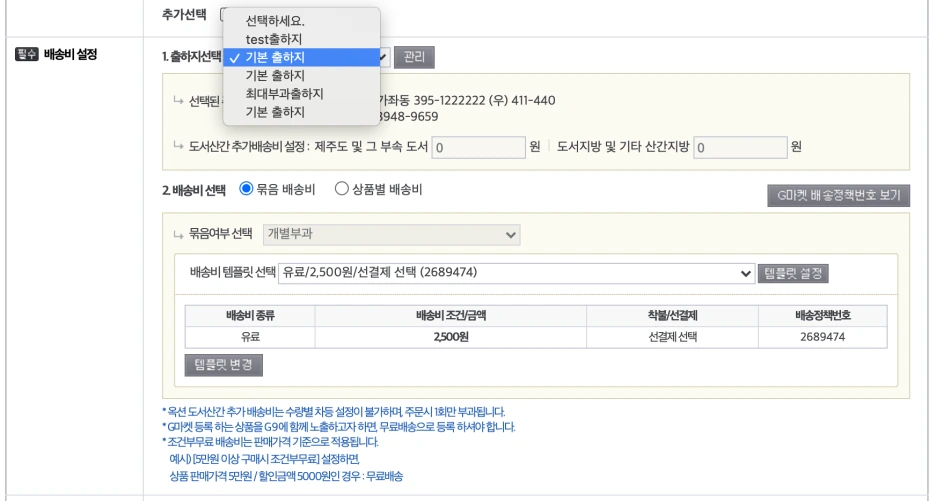 출하지 등록과 배송비 템플릿을 등록을 완료했다면 판매자는 상품을 등록하는 화면에서 이제 아래 그림처럼 간단한 선택만으로 저장된 배송 정책 정보를 자동 입력할 수 있다.