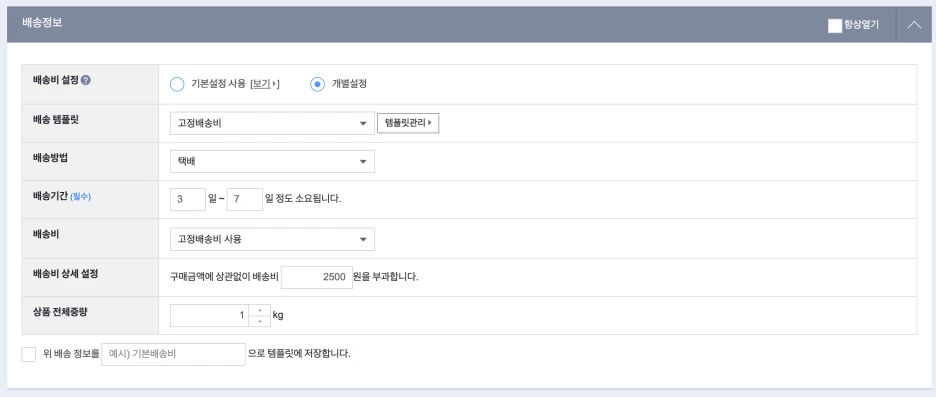 내 상품은 그냥 배송비가 고정으로 똑같이 2,500원 필요합니다.라고 등록할 때 사용하는 조건.
