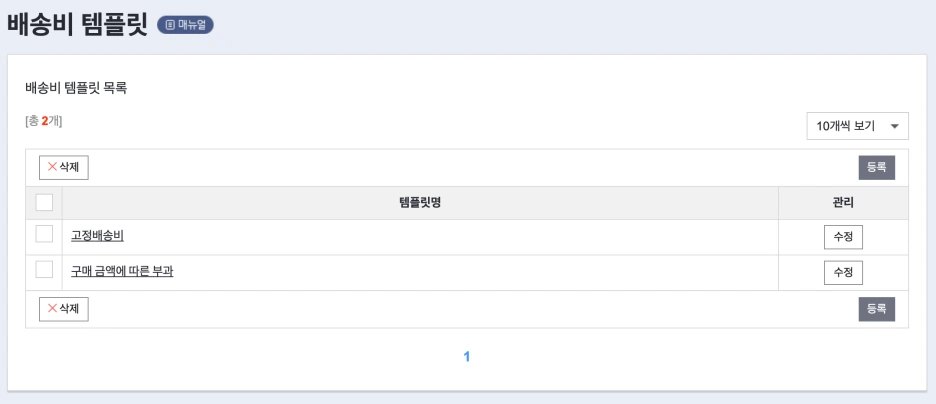이렇게 #배송비템플릿 등록하고 나면 이커머스 판매자 관리 페이지에는 아래와 같이 등록된 목록을 제공하면서 언제든 다시 조건을 수정할 수 있게 제공한다. 이렇게 관리하면 변경사항이 필요할 때 이 배송비 템플릿을 사용해서 상품을 등록했던 모든 상품의 조건이 한꺼번에 모두 수정 적용될 수 있다.
