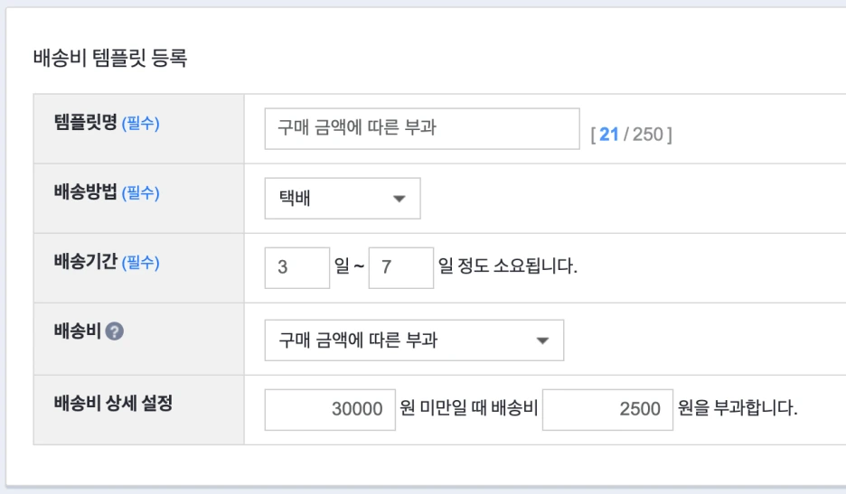 [ ]원 미만일 때 배송비 [ ]원을 부과합니다.라고 Form형식이 자동으로 바뀌면서 해당 조건에 맞는 값을 입력할 수 있게 서비스를 제공합니다. 이 Form에서 입력한 값은 장바구니, 주문, 결제 시스템에서 상품 가격을 처리하는 값으로 저장되어 사용됩니다.