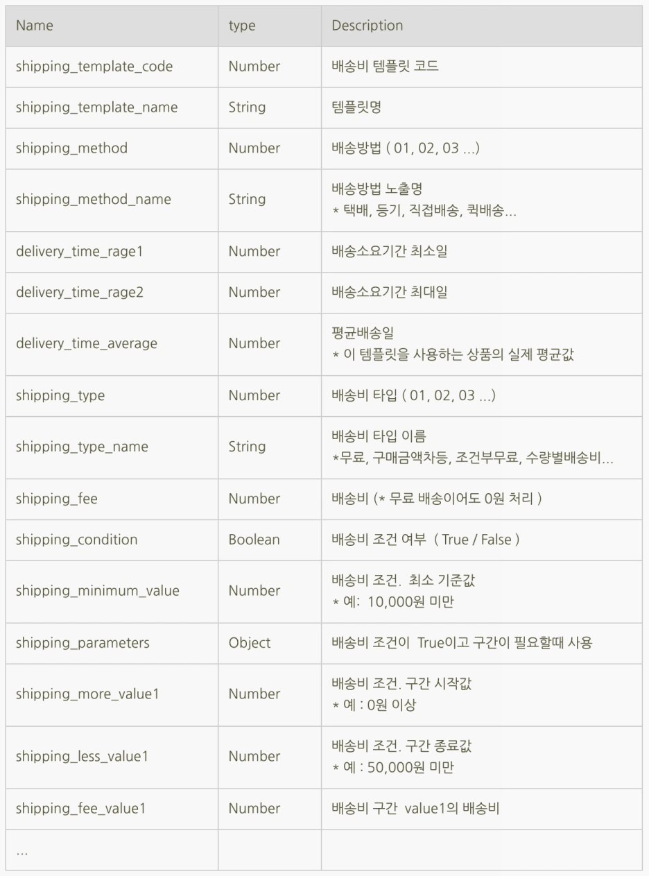 이런 배송비 템플릿의 조건의 플랫폼 구조를 backend 설계 기준으로 정리해보면 다음과 같은 표로 API를 설명할 수 있을 것 같다. 아래 표에는 어떤 값이 필수 값이고, 어떤 값이 아닌지는 일단 생략했다.
