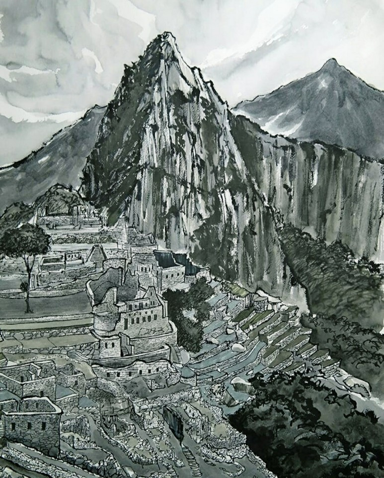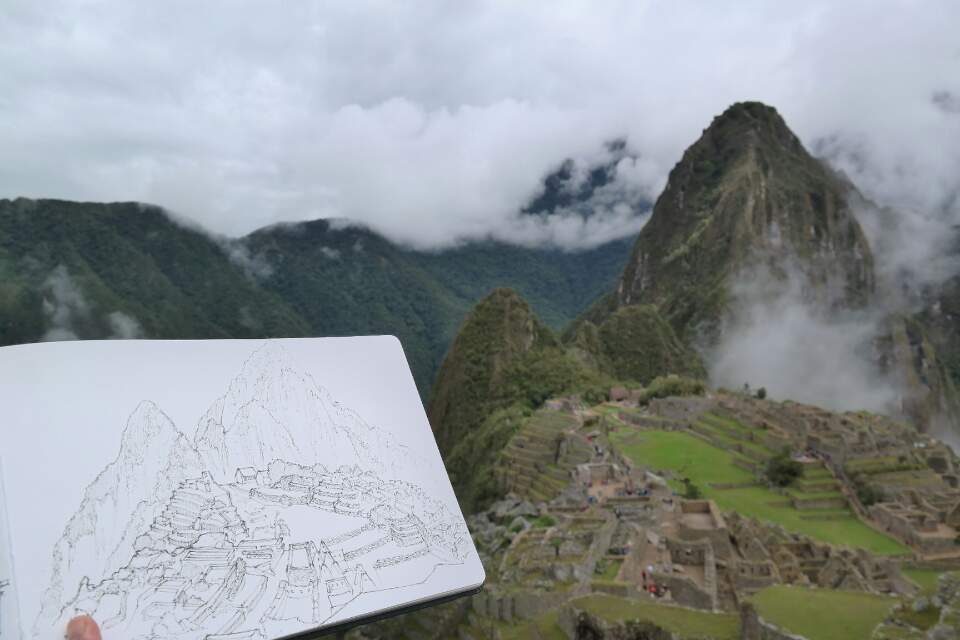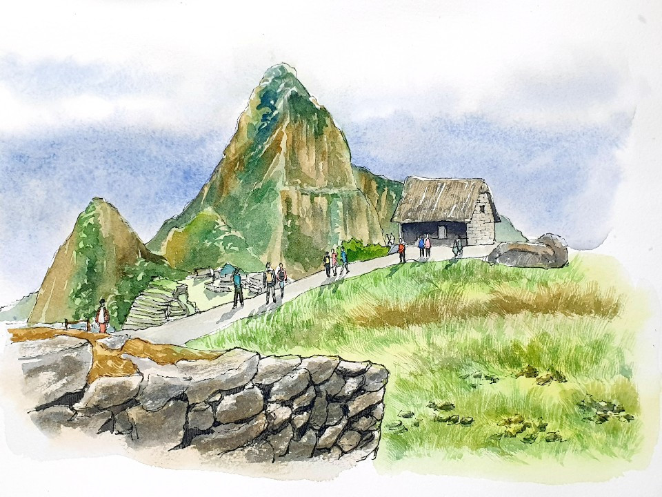 쌓인 돌담들 사이로 천천히 걷다 보면 금세 망지기의 집을 만날 수 있다. 마추픽추의 전경이 가장 잘 보이는 곳이라 그런 이름이 붙여졌다 하는데, 실제로 잉카제국 시절에도 망을 보던 곳으로 사용한 것으로 추정된다. 전경이 가장 잘 보이는 곳이기에 많은 방문객들이 이곳에서 기념사진을 찍기도 하고 휴식을 취하면서 마추픽추를 즐기고 있다. 나도 망지기의 집 옆, 돌바닥에 자리를 잡고 앉아 가방에서 스케치북을 꺼내 들었다. 여행하며 틈틈이 스케치들을 하고 있었기에 지금 내가 느끼는 마추픽추의 장엄함을 스케치로 남기고 싶었다. 스케치북 위에 선들을 하나둘씩 그어가면서 어느 정도 형태가 만들어지자 근처를 지나가는 여행객들은 그 모습이 신기한지 가까이서 구경을 하기도 하고 인사말을 건네기도 한다. 심지어 어떤 여행자들은 함께 사진을 찍자고도하고 스케치를 하는 내 모습을 찍더니 마치 마추픽추의 코스인 양 사람들이 지나갈 때마다 연신 나를 찍어댔다.