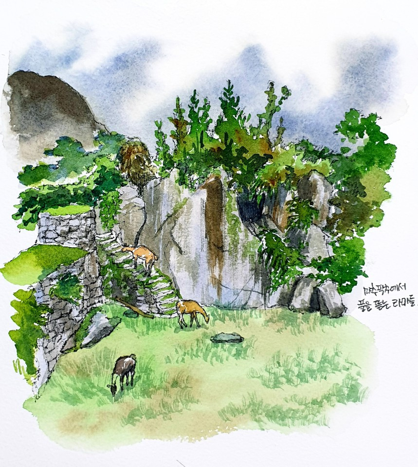 수로를 따라 천천히 걷다 돌벽 밑으로 라마들이 풀을 뜯고 모습이 보인다. 유적지와 어우러져 유유자적 풀을 뜯고 있는 라마의 모습을 보고 있노라니 왠지 모르게 마음이 편안해진다. 자연인이라는 기분이 이런 걸까.