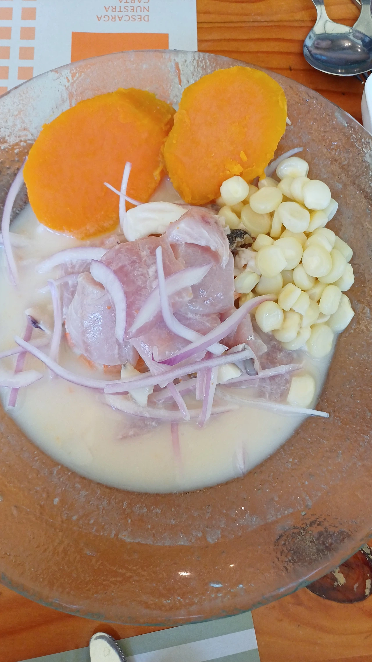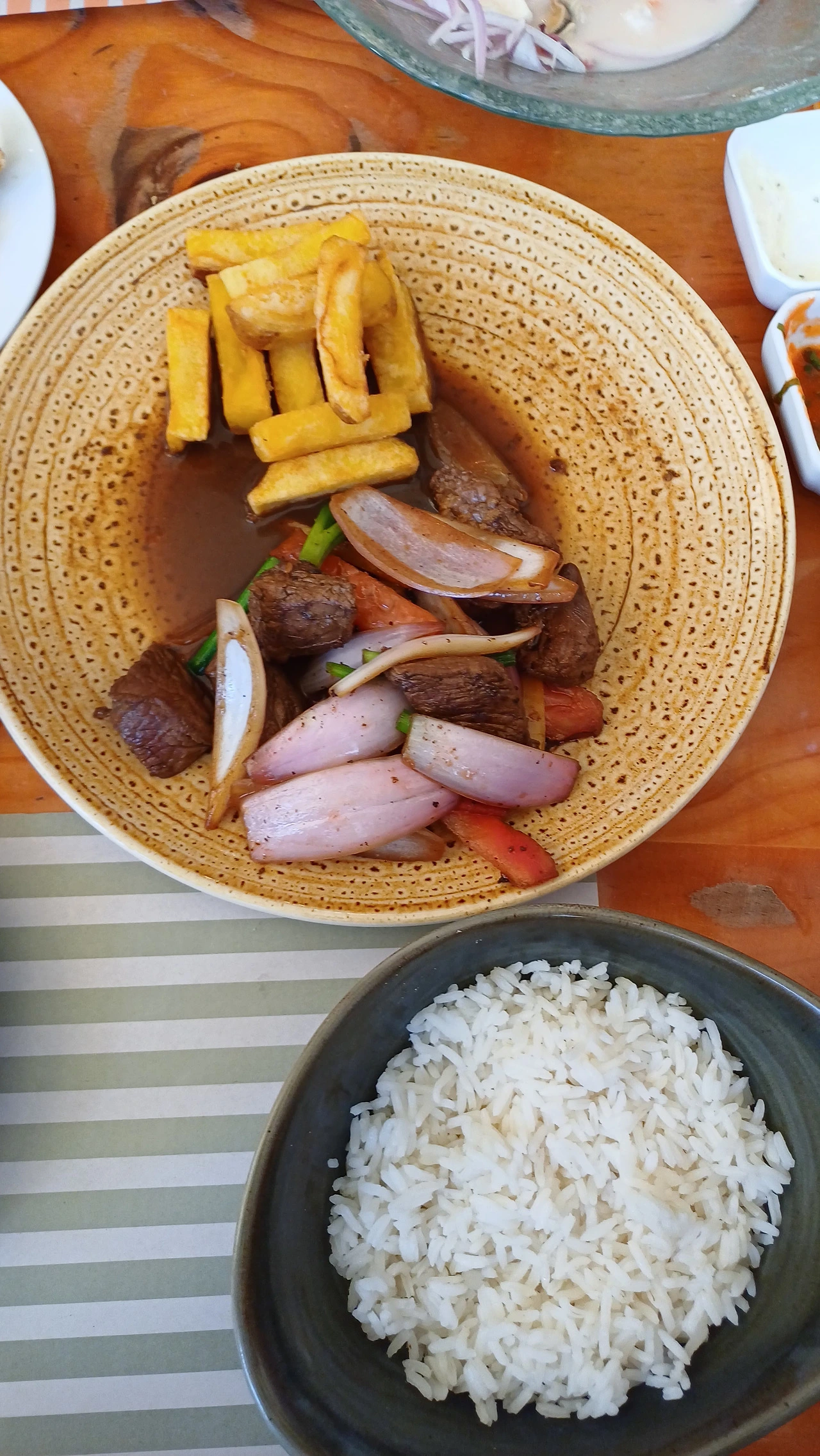 잠시후 데리러온 두 명의 인솔자와 메인광장으로 합류, 리마에서 유명하다는 식당에서 단체급식했는데 페루식 회무침인 세비체와 볶음밥, 생선튀김, 피시앤칩스와 제육볶음을 믹스한 뭔가가 나왔는데 n분의1로 55솔을 냈다.(산스타인광장 근처에서 다들 환전은 했고.) 음료는 각자 알아서 시키고 각자 계산. 저 맥주는13솔이더라. 팁도 각자 계산.
