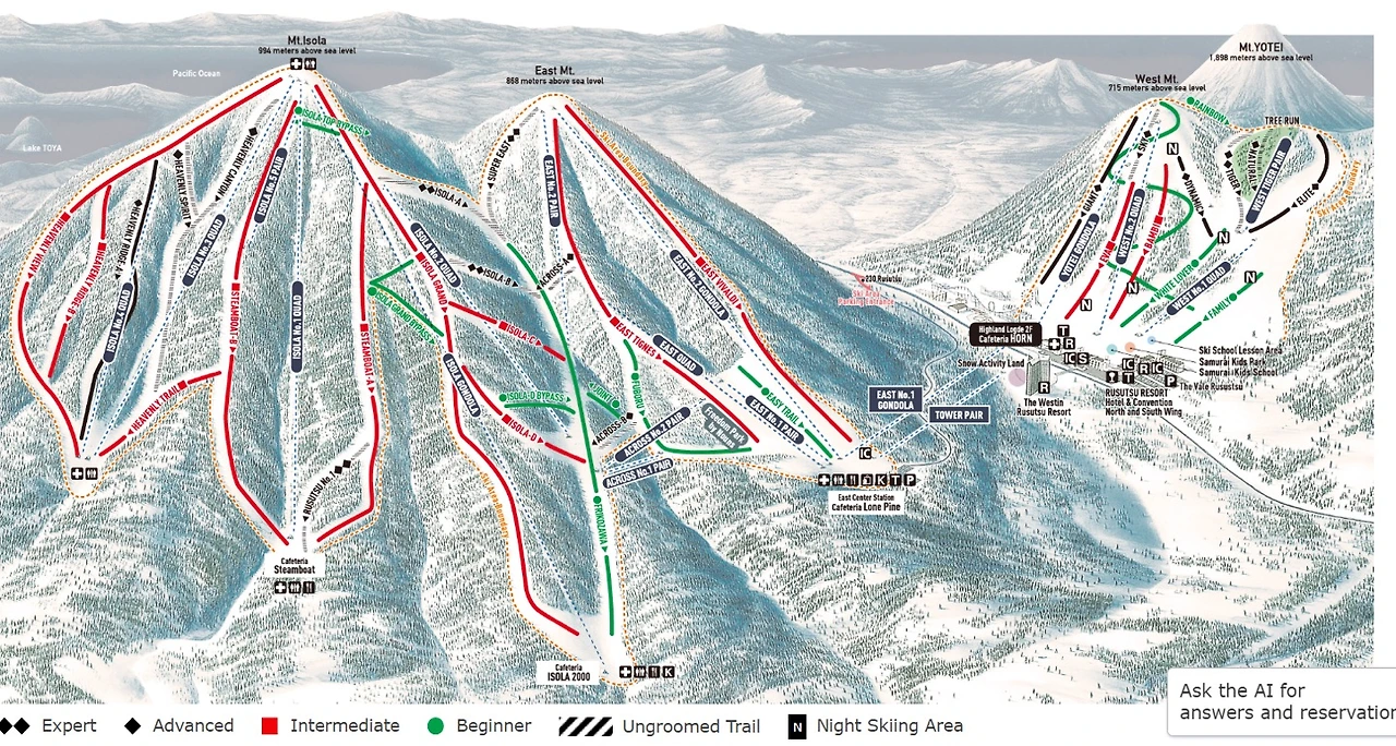 루스츠 스키장의 지도이다. 지도를 잘 보고 다녀야 한다. 아니면 나 같은 스린이 들은 필사의 에이자를 그리며 내려오다 허벅지가 터지기 예사이다. 검정>빨강>초록 순으로 상급 중급 초급으로 나뉘는데 결코 저걸 믿어선 안 된다. 무슨 기준인지 알 수 없다. 실제로 저 중에 초록이로 내려오다 욕을 욕을 했다. 길도 좁고 경사도 심하고 일본 스키장에서 보기 드문 낭떠러지 그물도 설치되어 있었다. 얼마나 무섭고 다리가 아프던지… 스키를 잘 타게 되고 싶다고 생각하면서도 맨날 구석에 처박아놓기만 하던 나를 반성했다.