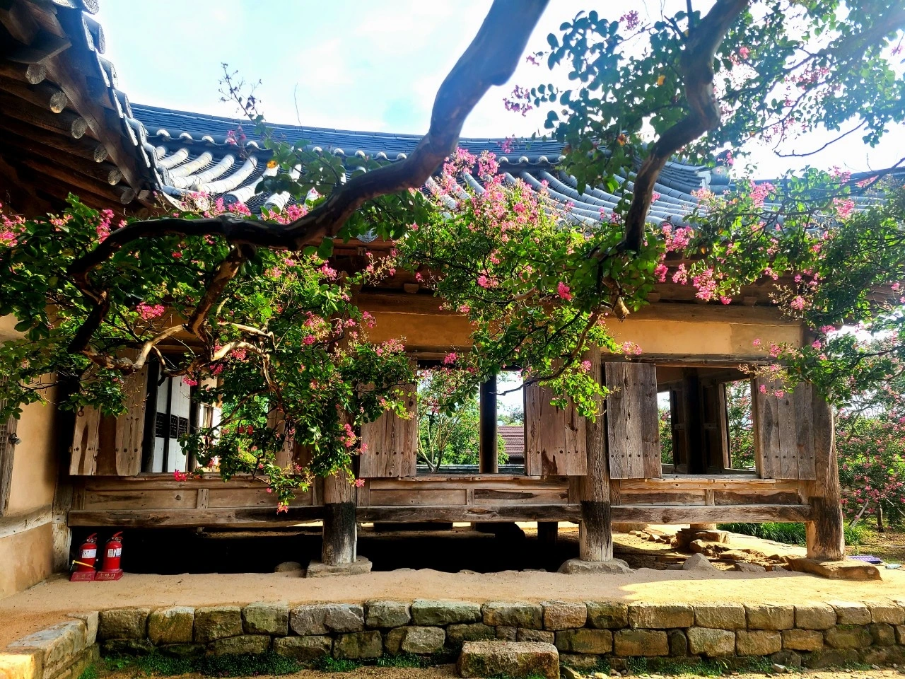 하목정에 들어서니, 붉게 핀 배롱나무 꽃잎이 정자 곁을 가득 물들이고 있었습니다.