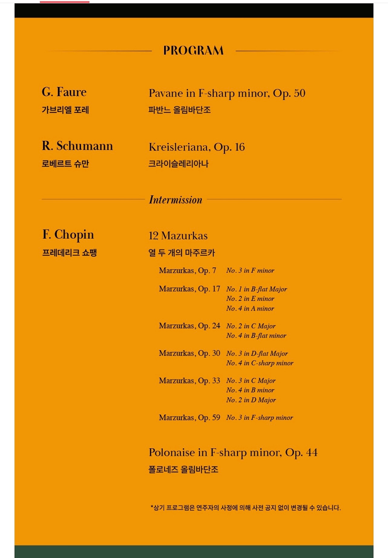 그래서 그는 세련된 기교와 감각적인 표현력으로 선명한 음색과 절제된 리듬감을 드러내는 도시적이고 세련된 마주르카를 선보였다.