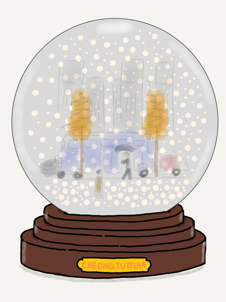 라운지에 앉아 쇼윈도를 통해 바라보는 눈 내리는 풍경은 평화롭다. 아름답다. 마치 커다란 스노볼.