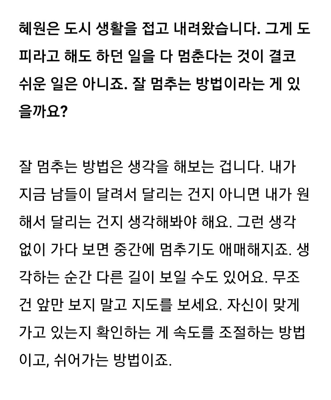 하지만 잘 멈춘다는 것도 쉬운 게 아닌 것 같다. 잘 돌아가고 싶었지만 처음에는 잘 되는 것 같다가도 중반부부터는 잘 되지 않았다. 내 몸이 마음대로 움직이지 않았다. 과거의 감정과 생각에 빠지고 미래의 두려움에 빠졌다.