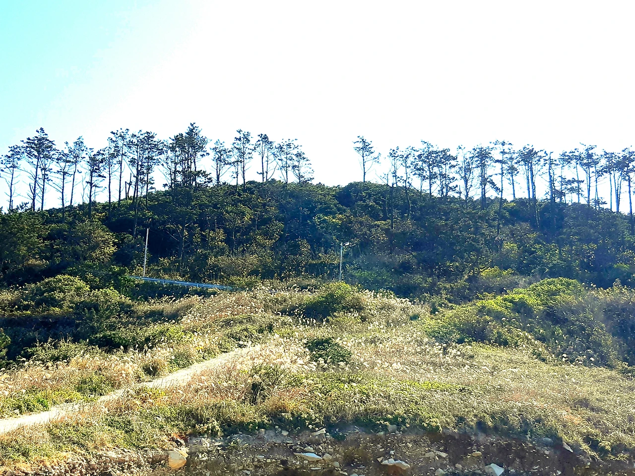 억새가 하얗게 핀 언덕, 소나무가 듬성듬성 서 있는 작은 섬이 나타난다. 유치원생의 그림 같은 순순한 능선이 햇살 아래 반짝인다.