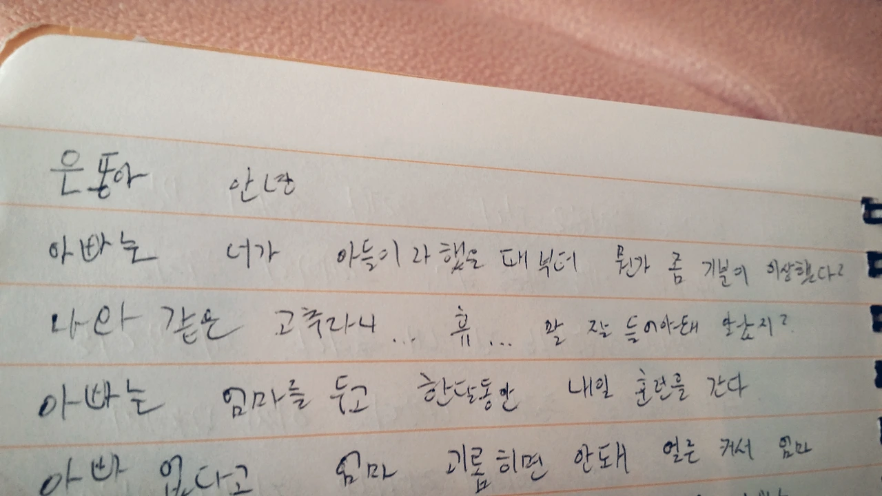 남편의 (개떡같은 글씨가 매력인) 태교일기가 바뀌었다. 아마도 본인의 과거를 되집어보며 고삐풀린 망아지마냥 뛰어다녔던 자신을 잡기위해 애쓰셨던 부모님을 떠올렸을 것이다.