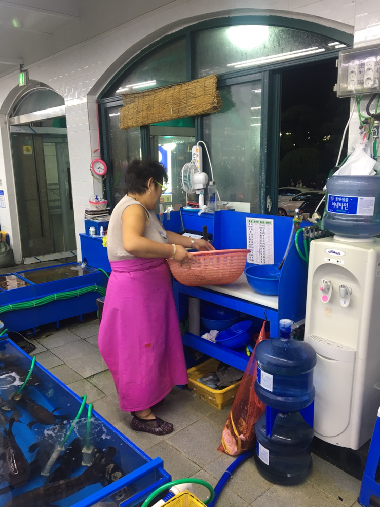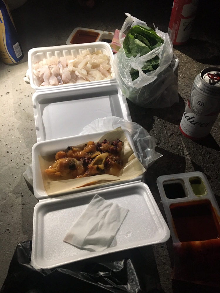 광어와 우럭 3만원, 멍게 6마리 5천원, 쌈 3천원어치 싸들고 수변공원 방향으로 걸어갔다. 가는 길에 부둣가를 발견! 따라가보니 많은 사람들이 돗자리를 펼치고 앉아 회를 먹고 있었다.