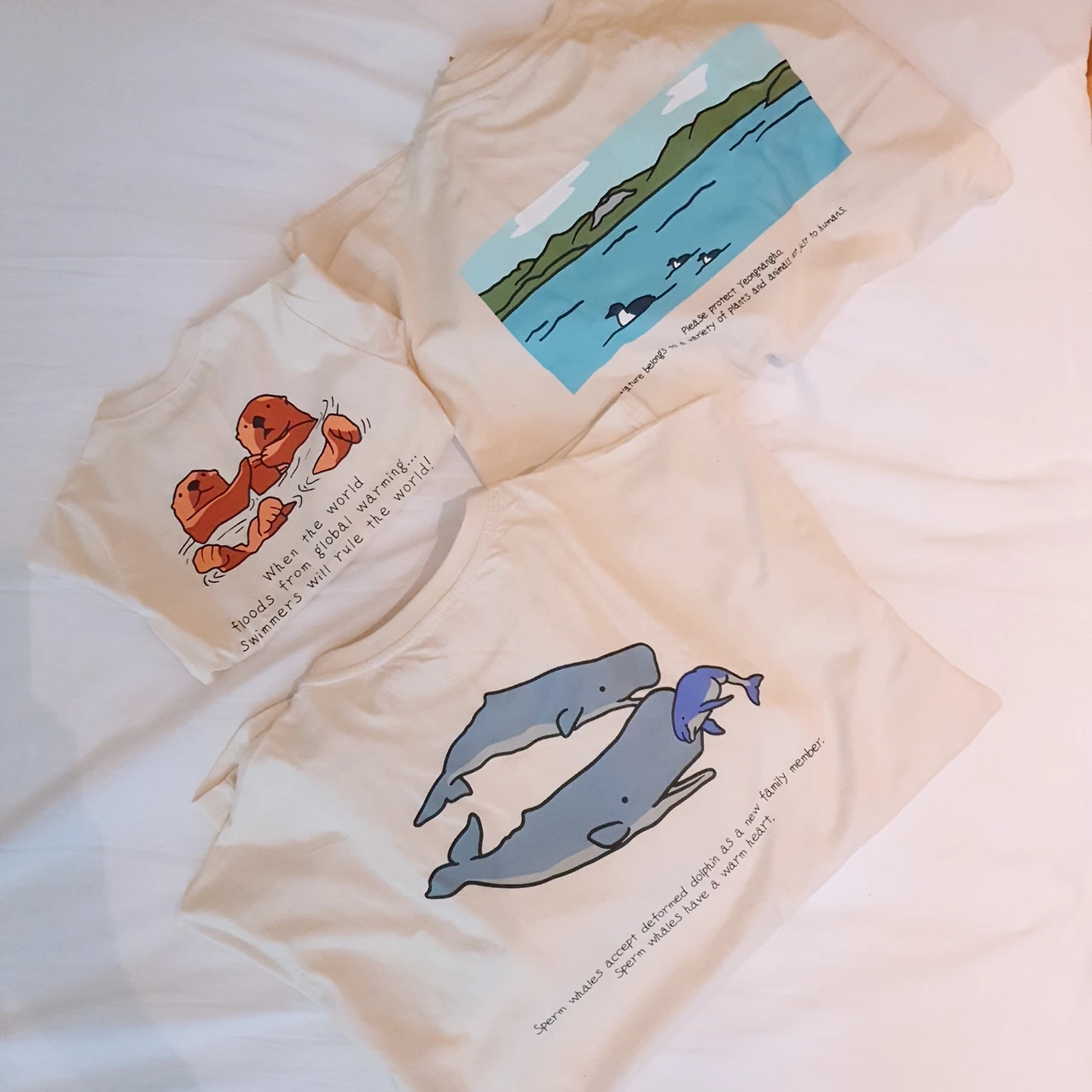 빵이 티셔츠 위의 해달은 잠잘 때 물에 휩쓸려 내려가지 않기 위해 서로 손을 꼭 붙잡고 잔다고 한다. 우리 빵이도 가족과 친구들과 서로 도와가며 함께 살아가길 바라는 마음을 담아 골랐다. 신랑 티셔츠 위에 그려진 향유고래는 유대감이 깊어 동료 중 낙오자가 있으면 기다려주고, 스킨스쿠버가 다칠 때 도와주기도 하는 마음씨 따듯한 동물이라고 한다. 다정하고 따뜻한 신랑과 닮은 것 같아 잘 어울렸다. 마지막으로 나는 속초 영랑호를 지키자는 메시지가 담긴 티셔츠를 골랐다. 해달 옷으로 빵이와 똑같이 입고 싶기도 했지만 환경과 로컬에 관심을 갖고 지내자는 의미로 다양한 프린팅을 선택했다.