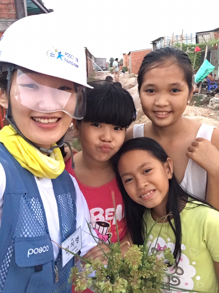 현장에서 작업을 시작하기 전에 포스코 대학생 봉사단과 다같이 모여 단체사진을 찍었습니다.