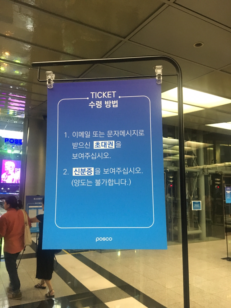 포스코 콘서트는 포스코센터 1층 로비에 500석을 비지정석으로 운영합니다. 초청권은 포스코 홈페이지에서 신청하실 수 있습니다. 추첨을 통해 초청권을 받으면 선착순으로 입장할 수 있어요.