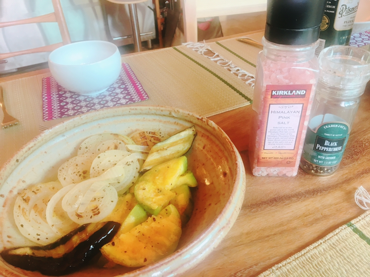 맛있게 구워진 호박, 가지, 양파에 소금 간을 곁들여 냠냠!