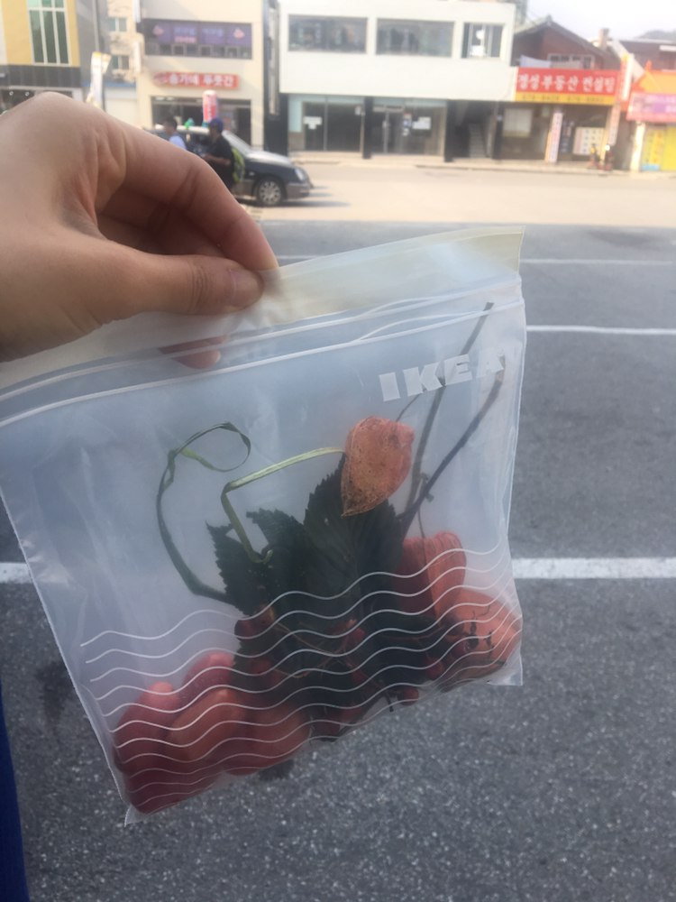 하 선생님께서 정원 투어를 하며 딴 방울 토마토와 꽈리, 빨간 열매를 선물로 주셨다.
