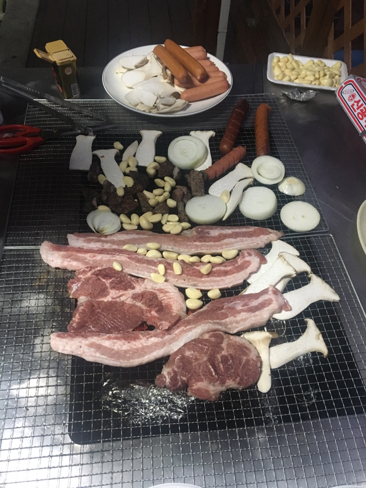 바베큐 장에서는 고기가 한창 익어가고 있었어요. 막내 동생이 운전에, 고기 굽기까지 고생이 많네요. 잘 자랐어요. 기특한 녀석! ㅋㅋ