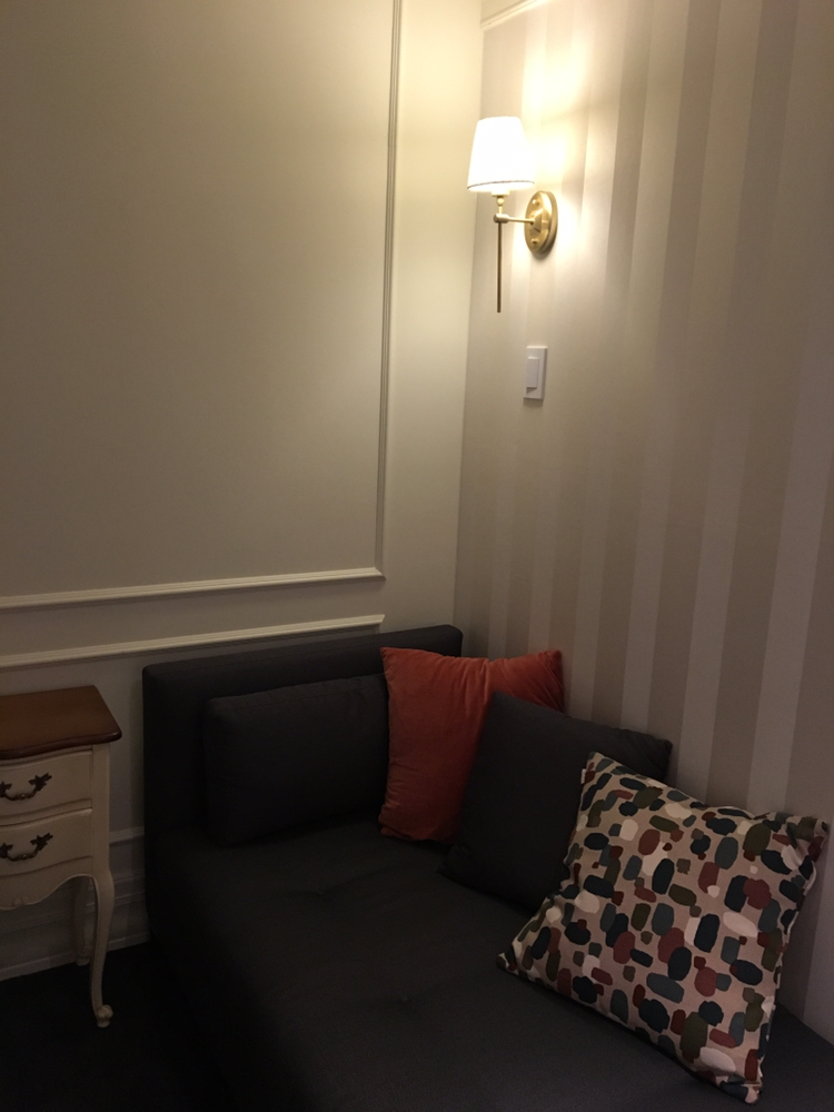 구석에 콩 박힌 편안한 의자에 기대어 앉아 따뜻한 차를 마시고, 마카롱도 한입 먹어봤어요.