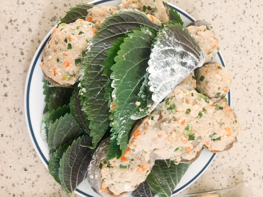 돼지고기 소를 깻잎과 표고버섯에 올려 놓기도 했어요.