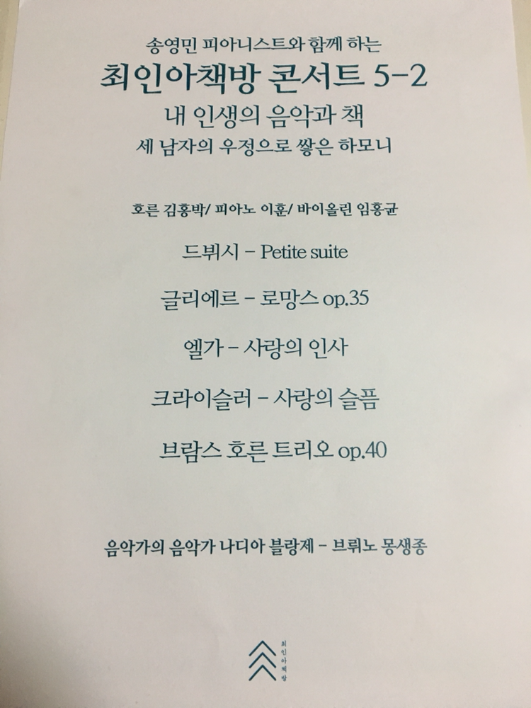 송영민 피아니스트와 함께 하는 최인아책방 콘서트 5-2는 '세 남자의 우정으로 쌓은 하모니'를 주제로 김홍박 호르니스트, 이훈 피아니스트, 임홍균 바이올리니스트가 함께했다.