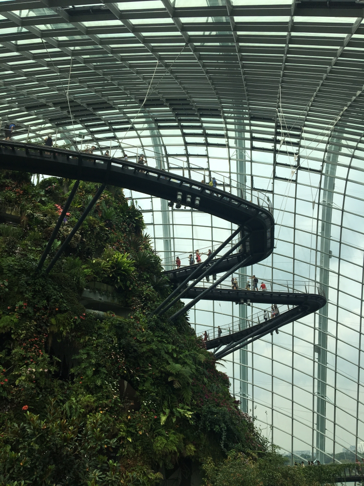 가든바이더베이에서 열대식물 및 고산지개 식물도 만나보았어요. 매립지 위에 만든 인공정원인데 산이 없는 싱가포르에 산 모양으로 높이 쌓아올린 지대에 식물들이 자라 있어요. 사람들이 구경할 수 있도록 뱅글뱅글 만든 코스를 걷다보면 싱가포르 전경도 함께볼 수 있답니다. 더운 날씨에서 잠깐 숨을 수 있는 시원한 공중정원이었어요!