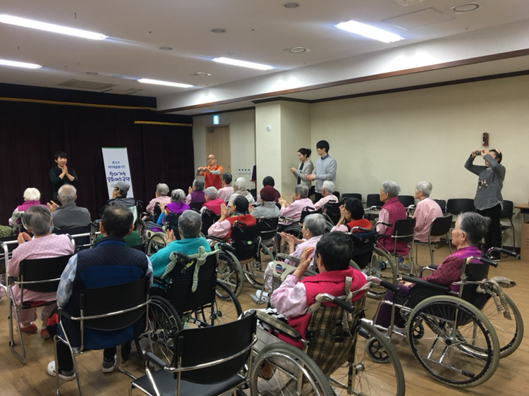 리허설을 마치자 어르신들께서 한 분, 두 분 들어오셨다. 거동이 불편하셔서 휠체어를 타시거나, 보행 보조기에 의지해서 복지사 선생님의 도움을 받아 천천히 이동하셨다.