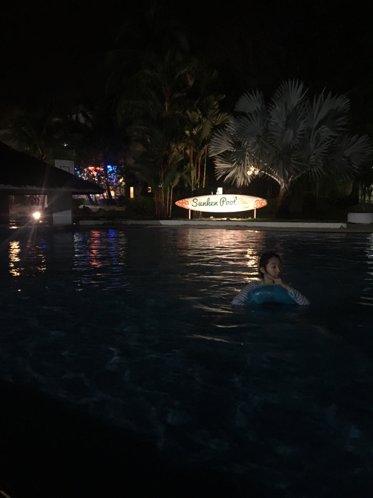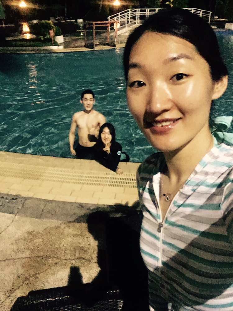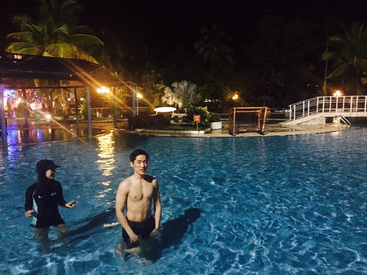 숙소에 돌아와서 야외 수영장으로 풍덩~ 들어가보았습니다. 야간에 즐기는 수영은 즐겁고, 낭만적인 것 같아요! 발차기 연습과 배영을 하며 왔다갔다 반복하다가 튜브와 공도 빌려 둥둥 떠다니기도 했어요~ 너무 재미있어서 동생하고 마감하는 시간까지 실컷 놀았습니다!>_<