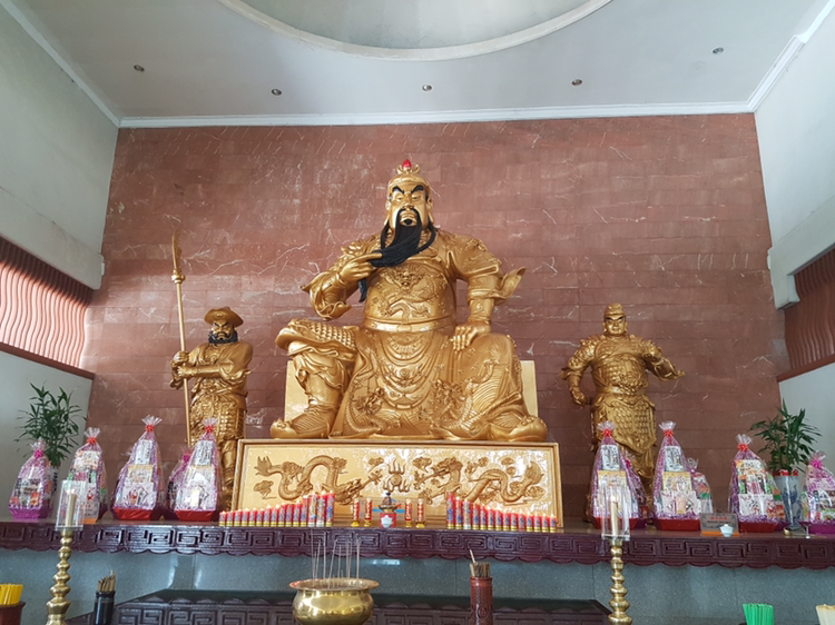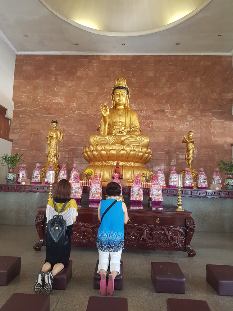 중국사원에는 관우, 달마, 그리고 불상이 보입니다. 우리나라에서는 절을 하며 기도하는데, 이곳에서는 향을 피우고 무릎을 꿇고 앉아 기도할 수 있는 의자가 있네요. 기도 문화도 따라 체험해보았습니다.