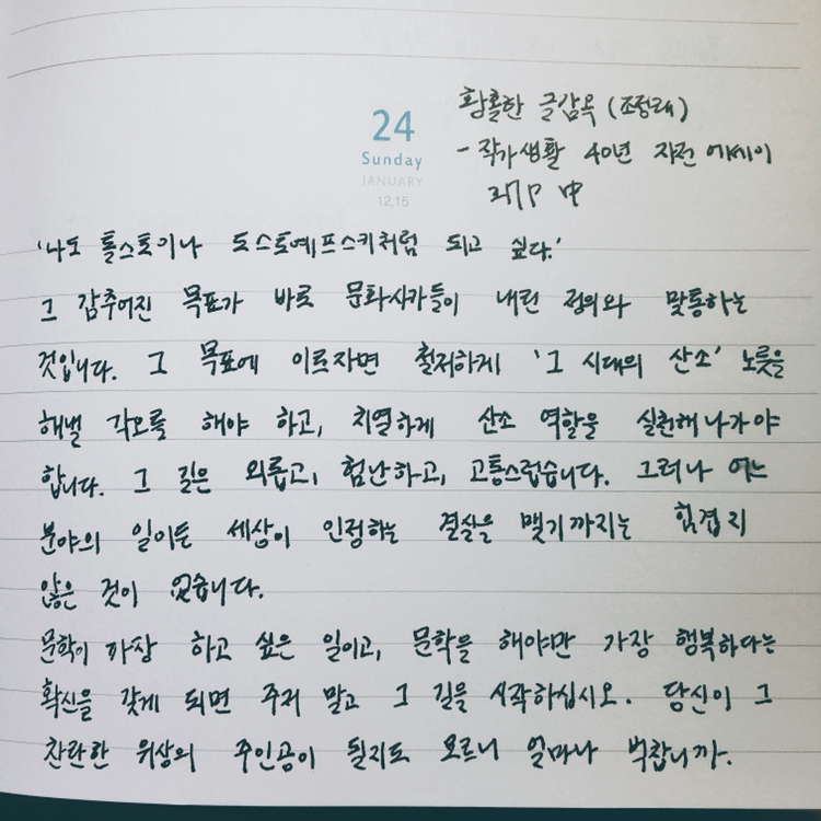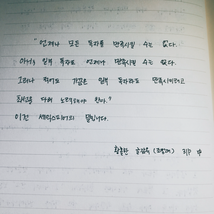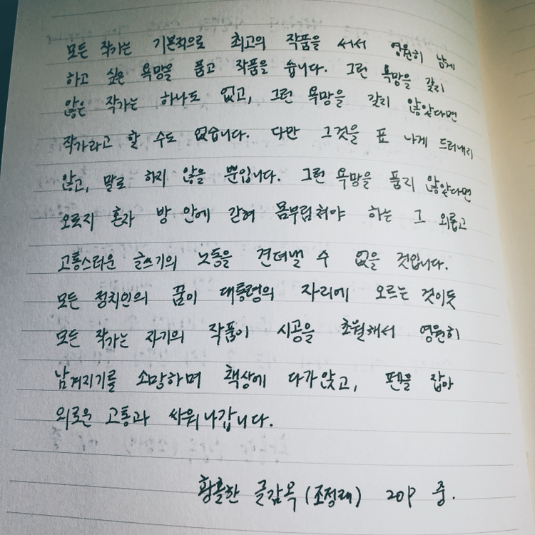얼른 작가가 되고 싶다는 조급함에 적당히 읽고, 별로 생각하지 않는 것을 지양하라는 말씀이었다. 글을 쓰겠다고 노트북의 껌벅이는 커서와 눈싸움 하면서 씨름하지 말고, 많이 읽고, 생각하는 과정 모두가 글쓰기라는 것을 잊지 말아야겠다. 혹여나 급한 마음에 그 순서가 거꾸로 되지 않도록 조심해야겠다.