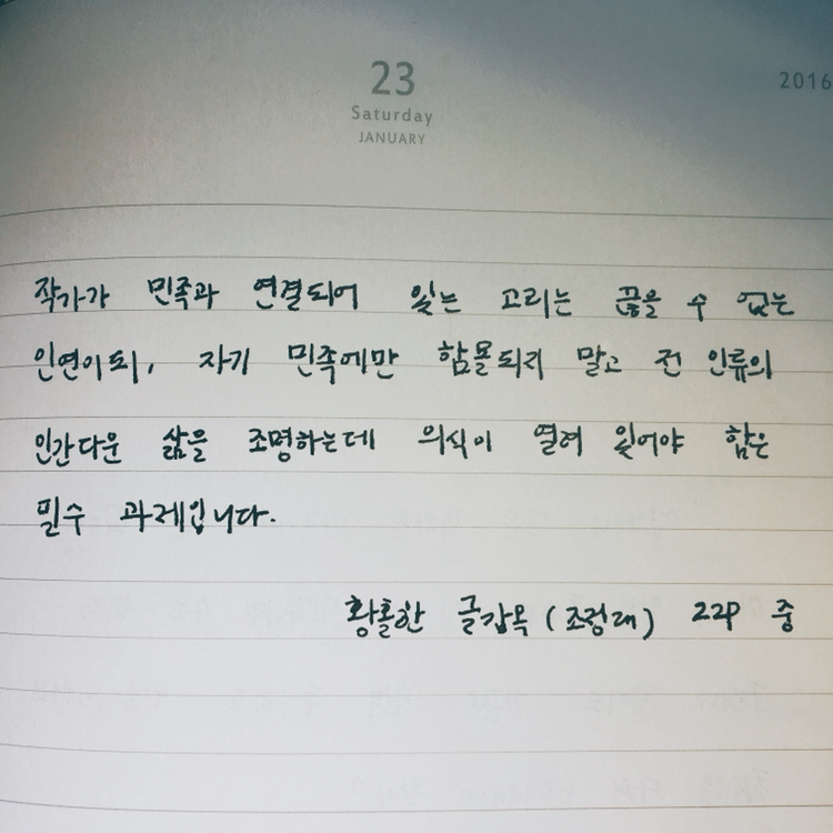 조정래 선생님은 일제시대와 한국전쟁, 산업화 시대까지 한국의 근현대사를 다룬 대하소설 ‘태백산맥’, ‘아리랑’, ‘한강’으로 유명한 작가이다. 한 인터뷰 기사에서 한창 집필에 열중할 때 전화를 받았는데 그 전화기가 폭발했다는 일화를 본 적이 있다. 온 신경을 집중해서 글을 쓰면 뇌파가엄청 나가서 파르르 전기가 오른다는 것이다. 퍽 인상 깊었다. 스쳐가듯읽었던 인터뷰 내용이 오랫동안 기억에 남아있을 만큼.