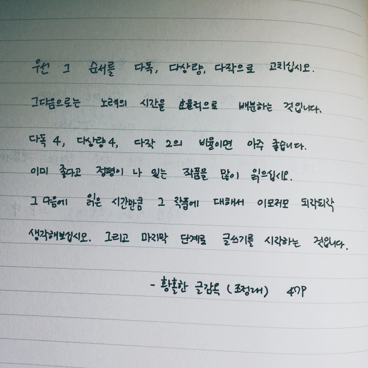 ‘우선 그 순서를 다독, 다상량, 다작으로 고치십시오. 그 다음으로는 노력의 시간을 효율적으로 배분하는 것입니다. 다독 4, 다상량 4, 다작 2의 비율이면 아주 좋습니다. 이미 좋다고 정평이 나 있는 작품을 많이 읽으십시오. 그 다음에 앍은 시간만큼 그 작품에 대해서 이모저모 되작되작 생각해보십시오. 그리고 마지막 단계로 글쓰기를 시작하는 것입니다.’