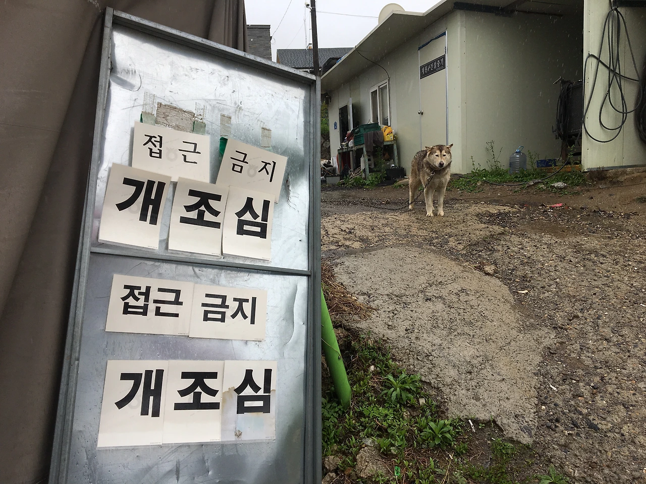 스키? 커다란 허스키 이름이다. 스키 앞에는 큰 글자가 적혀있다. 개.조.심. 그것도 두번이나 반복해서 강조하고 있다.