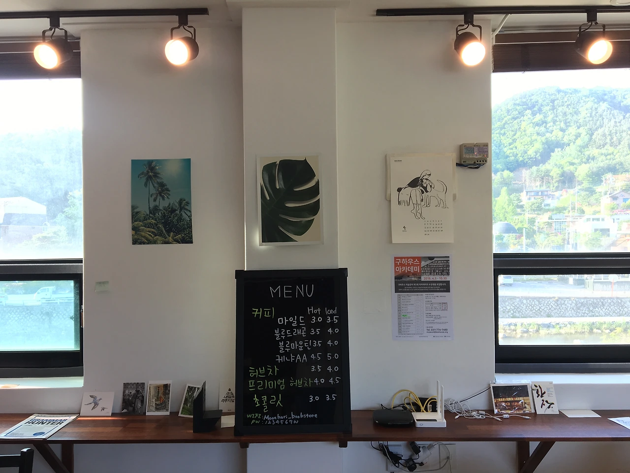 도착해서 가장 먼저 책방에 들렀다. 양쪽으로 난 창문 밖으로 산과 천이 보인다. 대표님께서 바람을 느껴보라고 창문을 살짝 열어주셨다. 솔솔 불어오는 바람을 느끼며 책읽기 좋은 공간이었다.