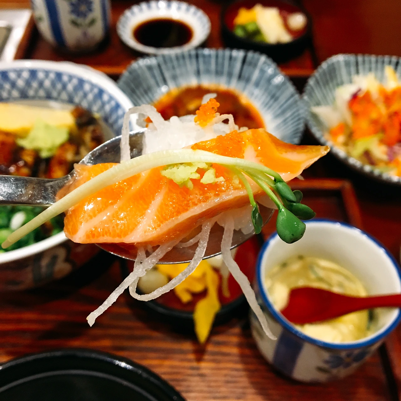 친구에게도 먹어보라도 권하고, 친구도 내게 연어덮밥을 한입에 먹기 좋게 만들어줬다.