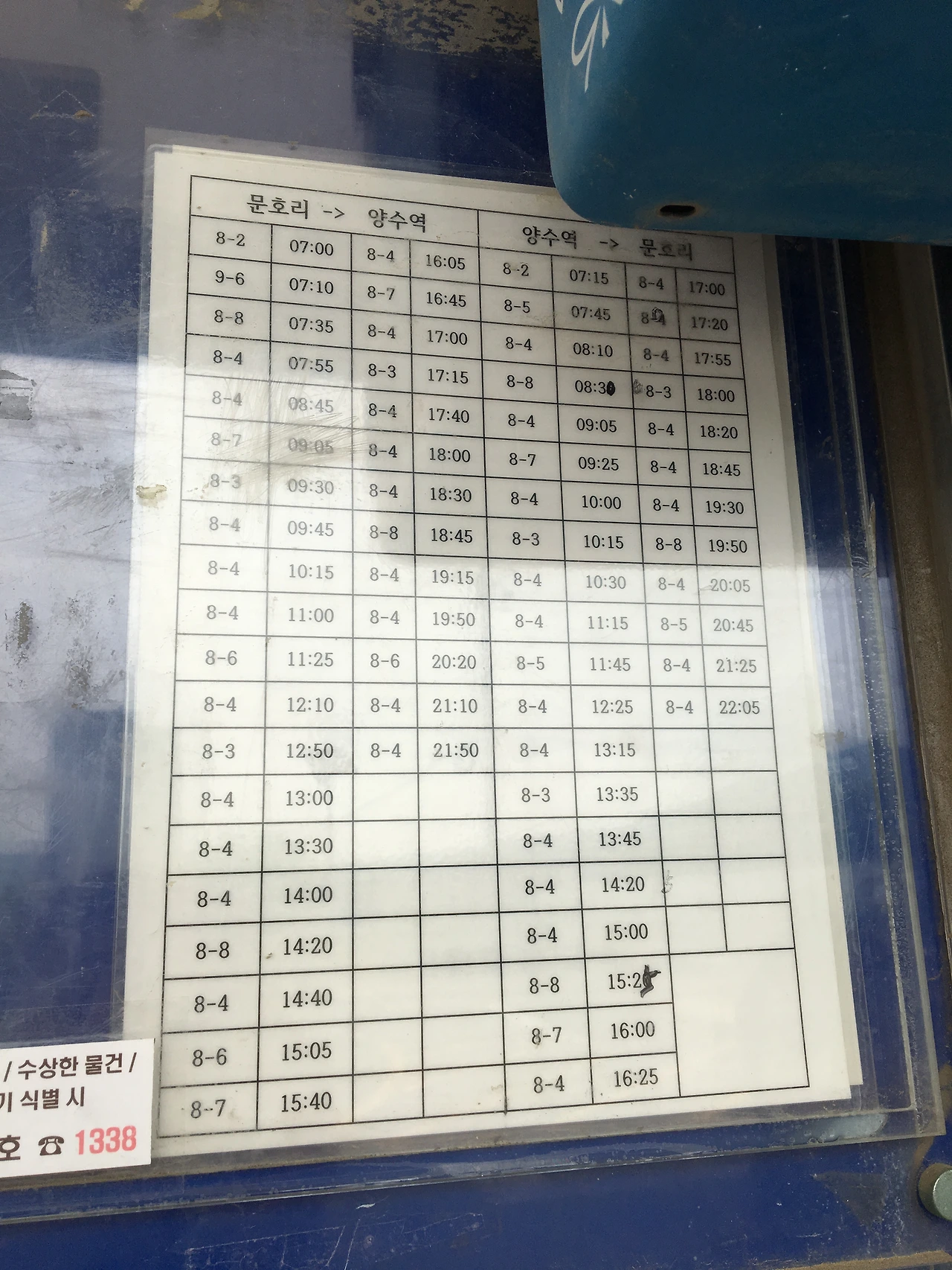 왕십리에서 만나 지하철을 타고 출발한 우리는 목적지로 가려면 양수역에서 내려서 버스를 타야 한다. 하지만 양평에 간다고 신나서 지하철 노선도를 보다가 ‘양평역’을 발견하고는 여기서 내리는 것으로 순간 착각했다. 환승하는 버스 정보를 검색하다가 양수역에서 내렸어야 했다는 것을 깨달은 우리. 지금이라도 발견해서 다행이다, 내려서 돌아가자.
