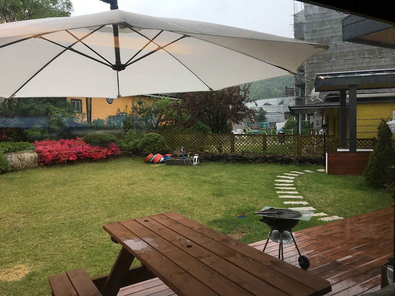 마당에서는 물놀이를 즐길 수 있어 아이가 있는 부모라면 재밌는 시간을 보낼 수 있을 것이다. 마당에는 동네 고양이들이 찾아오기도 한다.