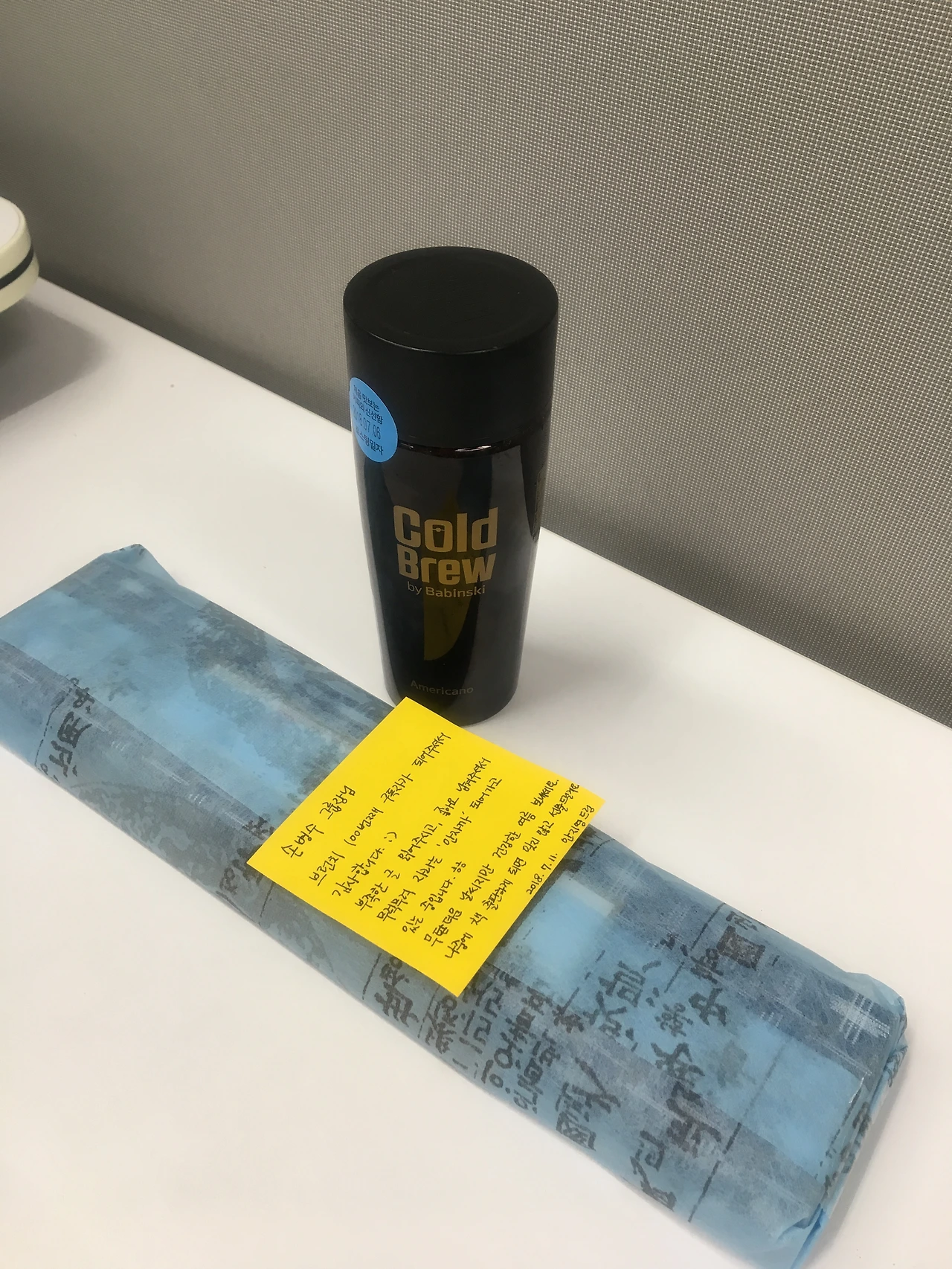 선물로 무엇을 드릴까 고민하다가 캘리그라피 부채와 커피쿠폰을 준비했다. 콜드브루 커피와 감사의 쪽지도 함께 그룹장님 책상에 올려두었다.
